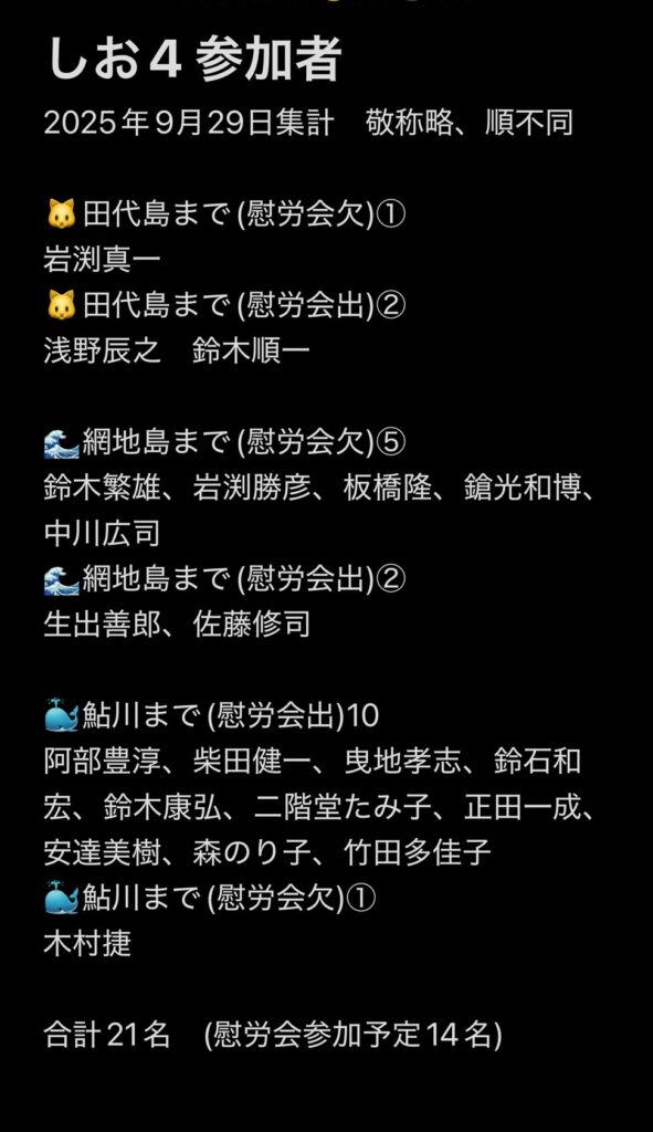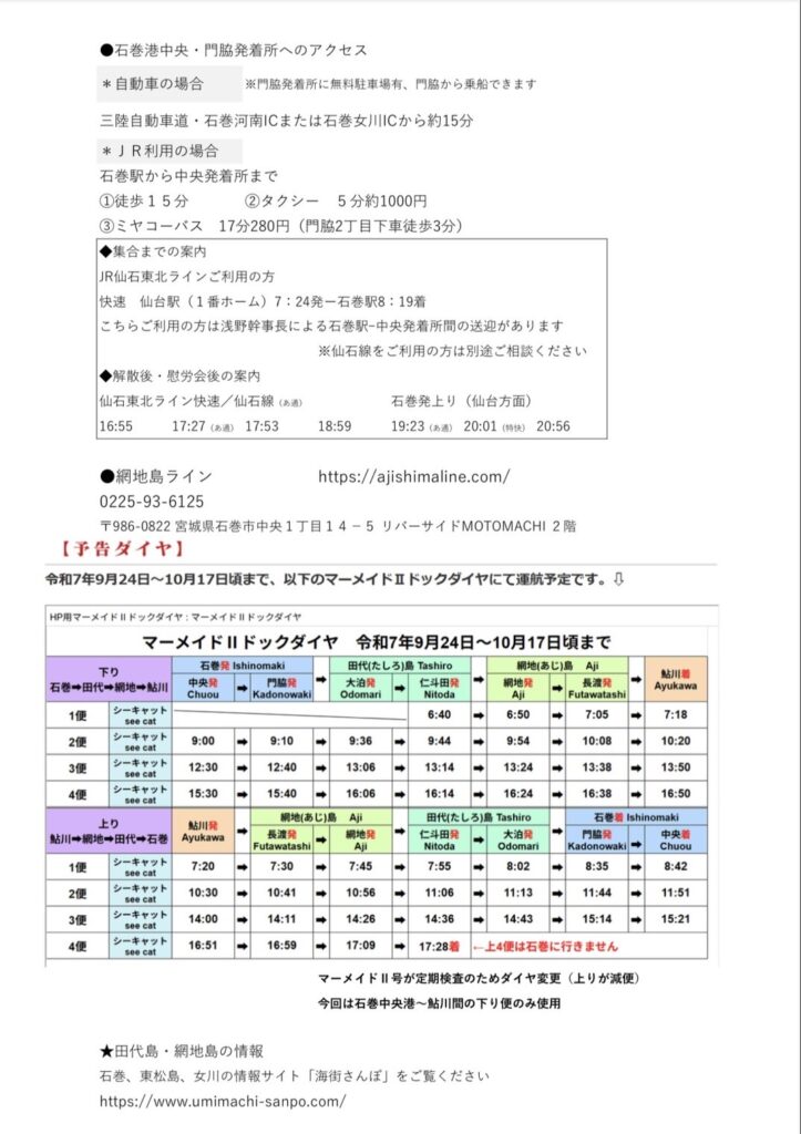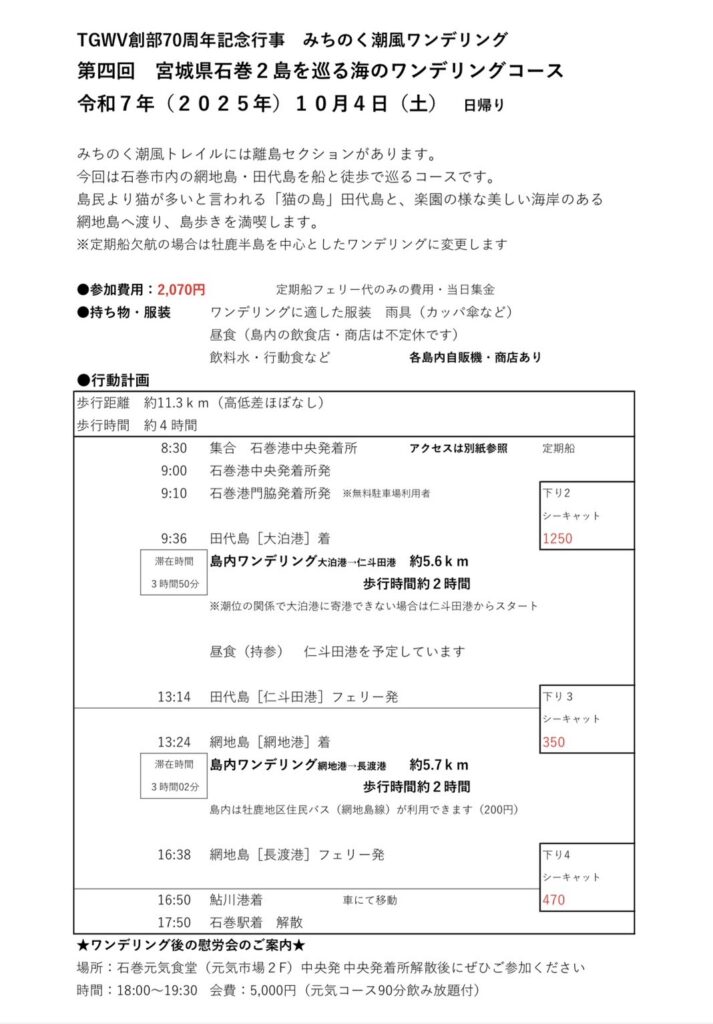 □「みちのく潮風ワンデリング」第4回(田代島網地島)参加者決定 70周年記念行事 2025.09.30 皆さんこんにちはいよいよ今週末、田代島網地島潮風ワンデリングとなります。体調を整えてご参加よろしくお願いします。 9/29(月)現在の島の天気予報です。毎日予報が変わりますが、服装や飲み物の参考にしてください。 船酔いしやすい方は念のため酔い止めなどお考えください。(takeda記)