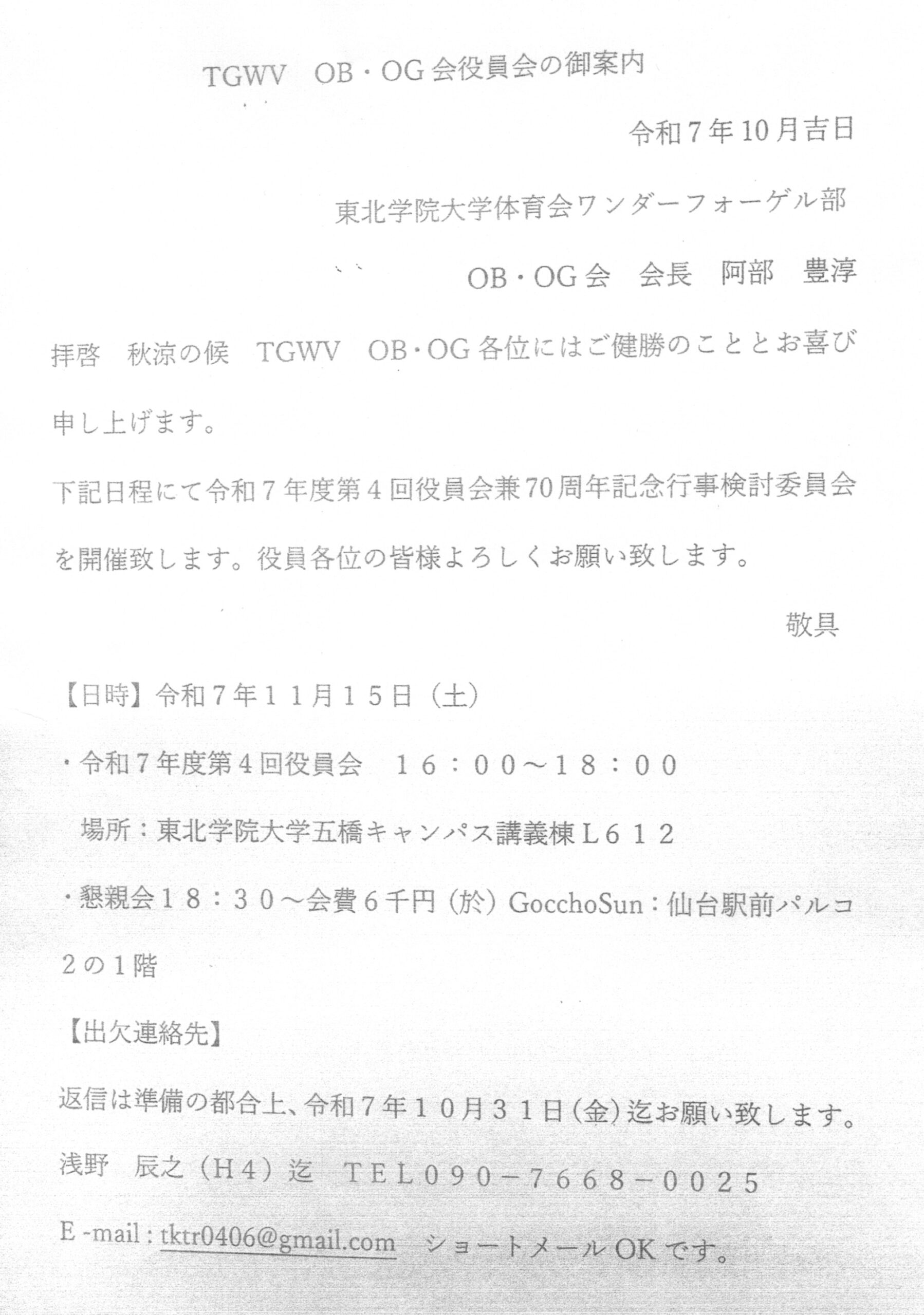 ◎2025年度第4回役員会及び創部70周年委員会開催のお知らせ 2025年11月15日(土)